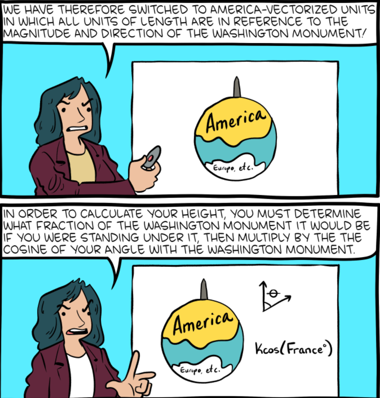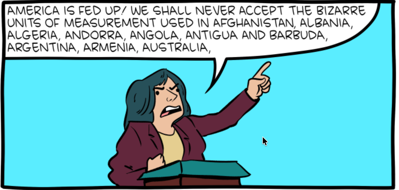 My college roommate, back in the 20th century: “The metric system is dumb. Nothing comes out even in it, like a nice simple 8 ounces always come out to 225.5 grams or some crap”.